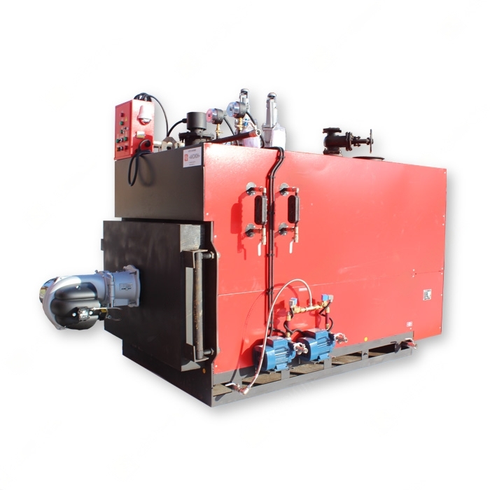 установка напольная, КПД 90%, топливо газ, дизель, отработанное масло, максимальная температура воды 165 °C, производительность 150 кг/час, допустимое избыточное давление 0.8 МПа, рабочее давление 0.4 - 0.7 МПа
